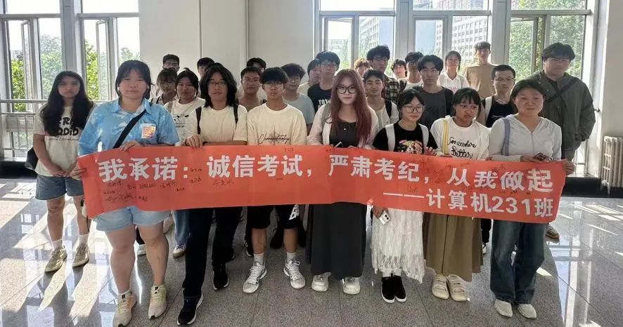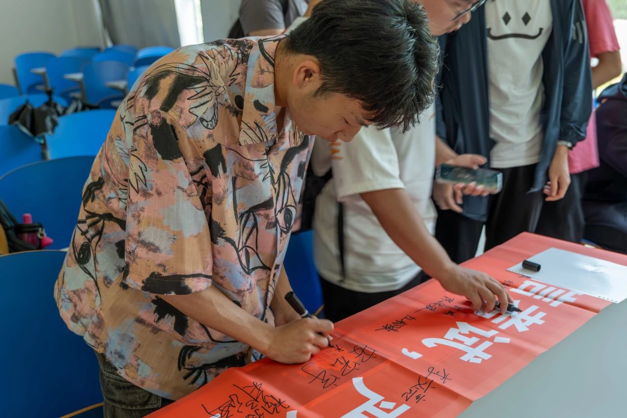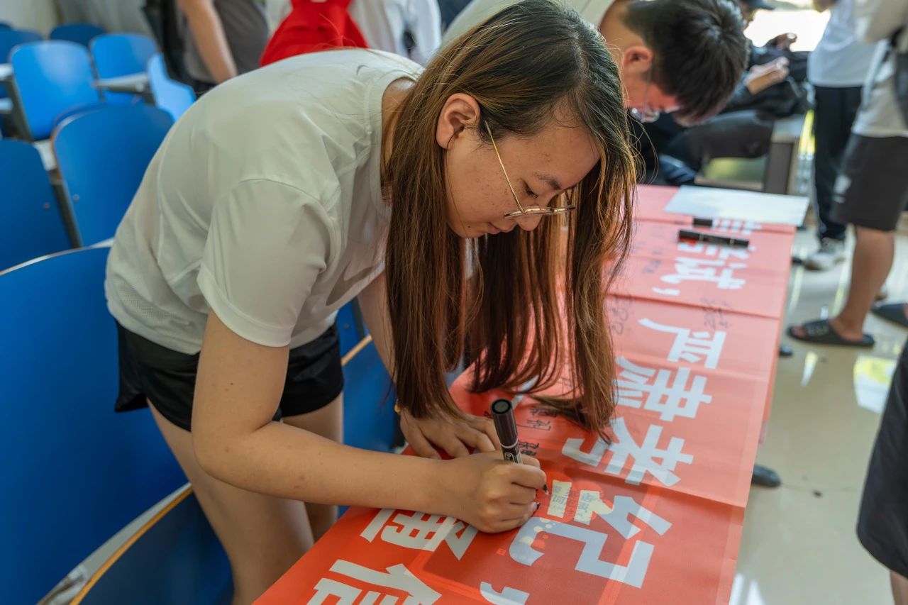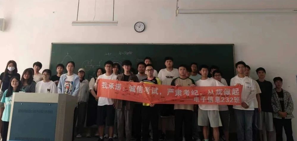 每一位考生在横幅上签字,承诺自觉遵守考试规则,以诚信的态度对待每一场考试。