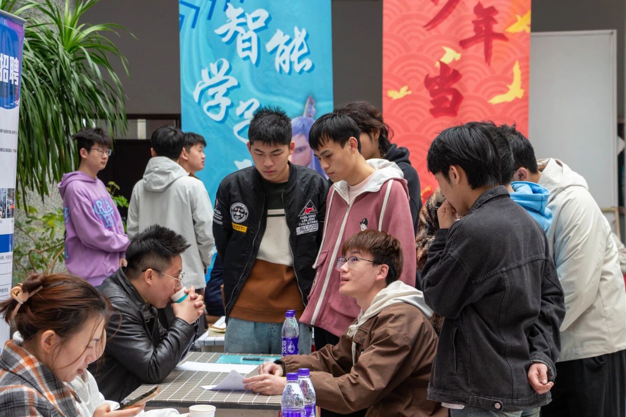 安排了志愿者在现场进行引导服务,他们热情地为前来应聘的学生指引各个企业展位的位置,帮助企业代表们熟悉场地布局,确保双选会能够有序、高效地进行。